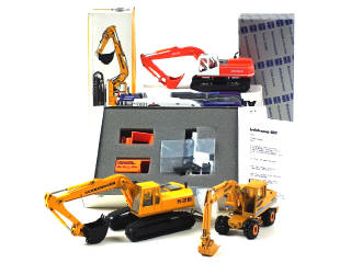 comprend : GOLDHOFER AST-1 tracteur de piste d'aéroport (avec sachet d'accessoires jamais ouvert de la marque NZG), DRESSER 625 E pelle rétro sur pneus, ATLAS AB 1304 LC pelle rétro sur chenilles (boîte en état 'c'), ZEPPLIN 526 pelle rétro sur chenilles (en état 'C') & SCHORLING mini-balayeuse/sableuse (avec notice & sachets d'accessoires, présenté dans un coffret en état 'c')
