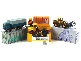 comprend : MAN porteur 6x4 32.240 benne carrière, MERCEDES porteur 4x2 plateau bâché (état 'B.c'), MERCEDES porteur 4x2 benne à ordures 'KUKA' (boîte en état 'c'), KOMATSU WA 270PT chargeur sur pneus (avec sachet d'accessoires) & KRAMER-ALLARD 418 mini chargeur sur pneus - on y retrouve les marques : CONRAD & NZG