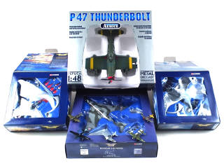 différentes échelles - comprend notamment : P47 THUNDERBOLT, HP VICTOR SR MK2, VOUGHT F4U-A1 CORSAIR, P51 D MUSTANG (2 exemplaires) & JUNKER 88 - on y retrouve les marques : DENNIS KNIGHT (échelle 1/200ème), CORGI TOYS & ARMOUR COLLECTION