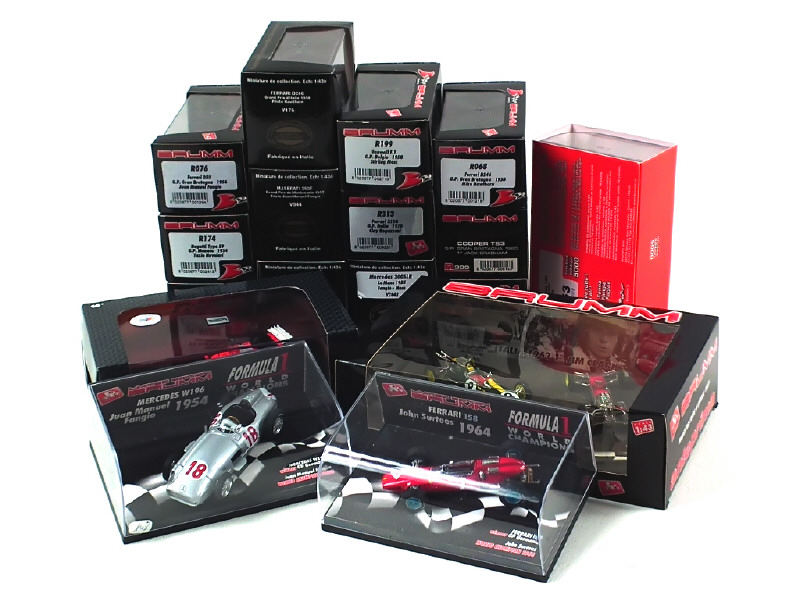 miniatures reproduisant les modèles : BUGATTI TYPE 59, MERCEDES W196, 300 SLR 1955, COOPER T53 (2 différents), VAN WALL1958, BRM P57, LOTUS 25, FERRARI D50, D246 (2 différents), 158, 312B, 200 F2, 2000 (2 la marque MATTEL), ALFA ROMEO 158 & MASERATI 250 F - on y retrouve les pilotes : TAZIO NUVOLARI, JUAN MANUEL FANGIO, JACK BRABHAM, STIRLING MOSS, GRAHAM HILL, JIM CLARK, MIKE HAWTORN, CLAY REGAZZONI, JOHN SURTIS, NINO FARINA, ALBERTO ASCARI & MICHAEL SCHUMACHER