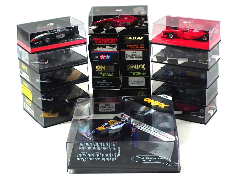 miniatures reproduisant les modèles : WILLIAMS RENAULT FW15B (boîte en état 'c'), BENETTON FORD B 192, B 193B, WILLIAMS FW 15C, FW19, LOLA 93 FORD V8 XB (boîte en état 'c'), FERRARI F300 (2 exemplaires différents), 643 91, 412 T1 (un élément à recoller), WILLIAMS FW14, WILLIAMS RENAULT CANON, BENETTON RENAULT B 195/2, BENETTON FORD B 194, WILLIAMS RENAULT FW17, Mc LAREN MERCEDES MP4/13, MP4/6 HONDA & WILLIAMS RENAULT 1997 - on y retrouve notamment les pilotes : ALAIN PROST, MICHAEL SCHUMACHER, DAMON HILL, NIGEL MANSELL, MARTIN BRUNDLE, RICCARDO PATRESE, GERHARD BERGER, EDDY IRVIN, DAVID COULTHARD, AYRTON SENNA & HEINZ HARALD FRENTZEN - on y retrouve les marques : ONYX, MINICHAMPS, TAMIYA & REISTER