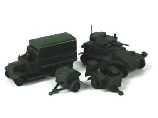 coffret produit de 1937 à 1941 - contient : char moyen (référence 151A avec une extrémité de garde-boue recollée), camion bâché à 6 roues (référence 151B), cuisine roulante (référence 151C avec traces de métal fatigue sur les jantes) & remorque tonne d'eau (référence 151D en état 'E' avec traces de métal fatigue sur les jantes)