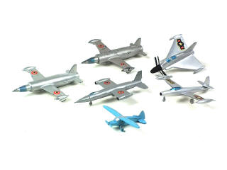 états de 'B' à 'D' - miniatures reproduisant les modèles : SUPER CIGALE (traces de métal fatigue), CONVAIR, THUNDERJET, TRIDENT, LEDUC 021 (2 exemplaires dont un en état 'E') - quelques petits manques sur certains décalques