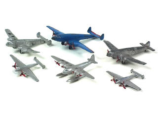 états de 'D' à 'E' - comprend (DINKY TOYS GB) : FOUR ENGINED LINER, SEAPLANE, TWIN ENGINED FIGHTER (2 exemplaires) & (DINKY TOYS FRANCE) POTEZ 662 (importantes traces de métal fatigue avec déformations) & BLOCH 220 (quelques manques)