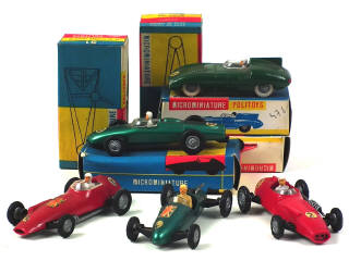série 'MICRO MINIATURES' - comprend : FERRARI, BRM (2 décalques incomplets), MASERATI, JAGUAR & COOPER NORTON (2 décalques incomplets) - carrosseries légèrement encrassées