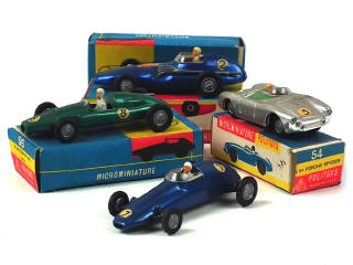 série 'MICRO MINIATURES' - comprend : COOPER 1500 (un décalque incomplet), PORSCHE formule II (un petit manque sur un décalque), VANWALL (petits manques sur les décalques) & PORSCHE SPYDER ('état 'B', quelques manques de pellicule argentée sur la carrosserie, suspension arrière affaissée)
