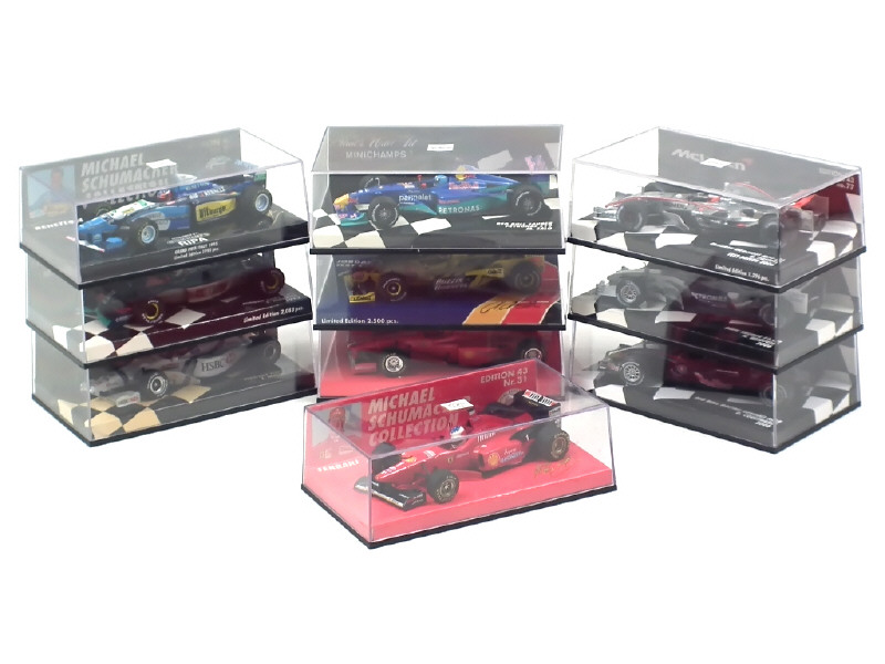 miniatures reproduisant notamment les modèles : STEWART FORD SF-2, BENETTON RENAULT B195, RED BULL SAUBER PETRONAS C19, FERRARI F310/2, Mc LAREN MERCEDES MP4-21, JORDAN MUGEN HONDA, JORDAN HART 192, BMW SAUBER F1.06, FERRARI 1998 & RED BULL RENAULT RB4 - voitures pilotées notamment par : G. MAGNUSSEN, MICHAEL SCHUMACHER, MIKA SALO, G. PAFFETE, HEINZ HARALD FRENTZEN, S. MODENA, NICK HEIDFELD & DAVID COULTHARD
