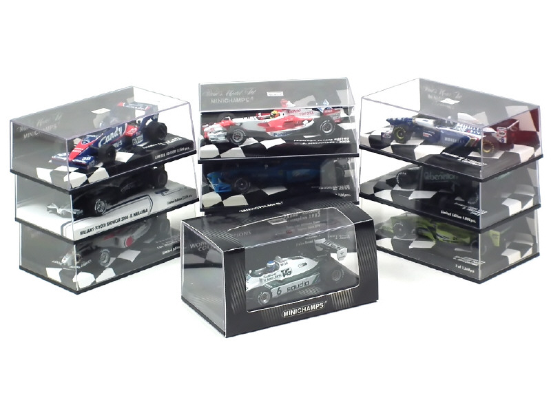 miniatures reproduisant notamment les modèles : PANASONIC TOYOTA TF106, BENETTON PLAY LIFE 2000, PROST PEUGEOT AP03, WILLIAMS FW17 RENAULT, WILLIAMS-TOYOTA 2008, BAR HONDA 006, MINARDI 2000, TYRRELL FORD 012, TOLEMAN TG 183 & TAG WILLIAMS FW08 - voitures pilotées notamment par : RALF SCHUMACHER, ALEXANDER WURZ ,JEAN ALESI, DAVID COULTHARD, K. NAKAJIMA, JASON BUTTON, J. MAZACAN, D. SULLIVAN, DEREK WARWICK & KEKE ROSBERG