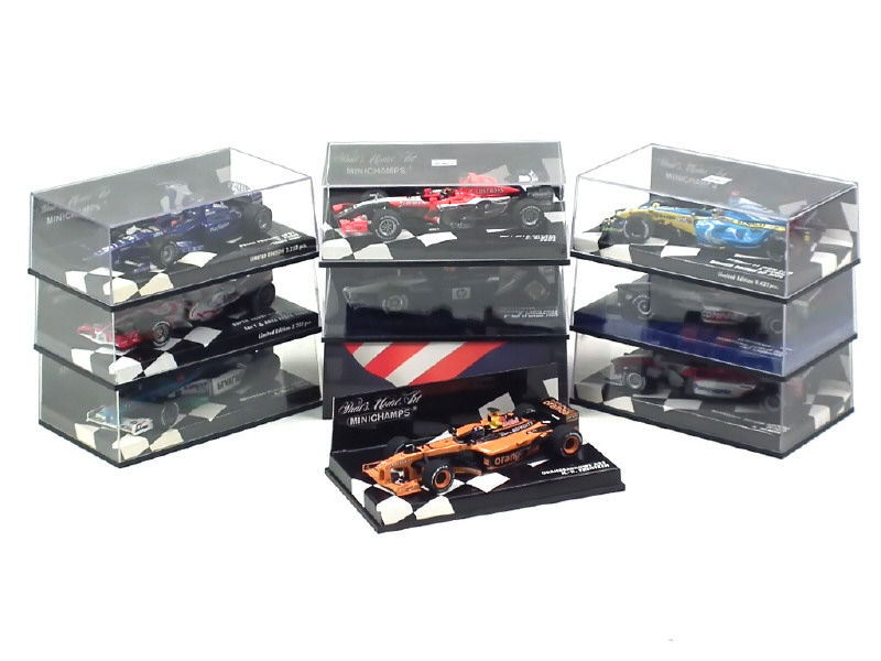 miniatures reproduisant notamment les modèles : ORANGEARROWS A23, WILLIAMS 2000, PROST PEUGEOT AP 01, WILLIAMS BMW FW24, MF1 M16 TOYOTA, RENAULT R26, SUPER AGURI HONDA SA06, BENETTON PLAY LIFE B199, PANASONIC TOYOTA TF102 & MINARDI PS01 - voitures pilotées notamment par : HEINZ HARALD FRENTZEN, RALF SCHUMACHER, OLIVIER PANIS, C. ALBERS, FERNANDO ALONSO, A. SUZUKI, ALEXANDER WURZ, A. Mc NISH & A. YOONG