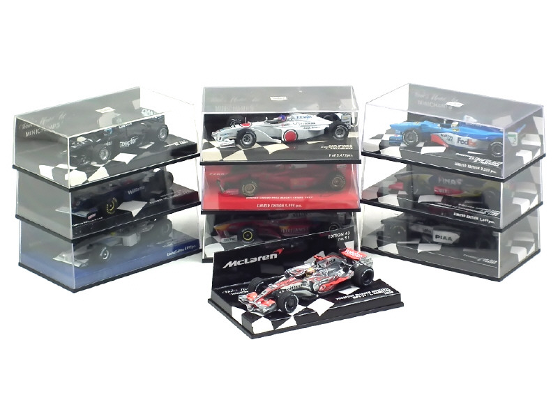 miniatures reproduisant les modèles : VODAFONE Mc LAREN MERCEDES MP4-23, TYRRELL FORD 026, DALLARA SODEMO F399 (F3), ARROWS A19, BAR HONDA, FERRARI F310B, BENETTON PLAY LIFE 1998, WILLIAMS FW15, FW21 & WILLIAMS 1999 - voitures pilotées notamment par : LEWIS HAMILTON ,R. ROSSET, JASON BUTTON, MIKA SALO, JACQUES VILLENEUVE, MICHAEL SCHUMACHER, GIANCARLO FISICHELLA, DAMON HILL & ALESSANDRO ZANARDI