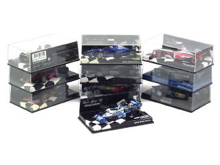 miniatures reproduisant les modèles : TYRRELL P34 FNCB MONTE CARLO 1977, FORCE INDIA VJMO1 2008, MINARDI EUROPEAN P501, BENETTON B195 1995, ORANGE ARROWS ASIA TECH A22, ARROWS YAMAHA FA 18, BAR 01 SUPERTECH 1999, FERRARI 412 T1, WILLIAMS BMW FW22 & SHOWCAR PROST 1999 - voitures pilotées par : RONNY PETERSON, GIANCARLO FISICHELLA, FERNANDO ALONSO ,MICHAEL SCHUMACHER, J. VERSTAPEN, P. DINIZ, R. ZONTA, JEAN ALESI, RALF SCHUMACHER & JARNO TRULLI