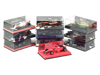miniatures reproduisant les modèles : TYRRELL FORD 026, BAR HONDA 03, ORANGE ARROWS A23, PROST PEUGEOT 1998, Mc LAREN MP4/13 MERCEDES, BENNETON RENAULT B194/B195, BENETTON FORD 192, FERRARI F300, Mc LAREN FORD MP4 & WILLIAMS BMW FW23 - voitures pilotées par : TAGORU TAGAGI, OLIVIER PANIS, E. BERLONDI, DAVID COULTHARD, JOHNNY ERBERT, MICHAEL SCHUMACHER, JOHN WATSON & RALF SCHUMACHER