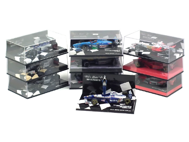 miniatures reproduisant les modèles : FERRARI F310B, FORCE INDIA VJMO 1, Mc LAREN MERCEDES MP4/11, TYRELL FORD 1998, STEWART FORD SF-2, MINARDI FORD M1 01, LIGIER HONDA JS41, WILLIAMS RENAULT, BENNETON 1993, WILLIAMS RENAULT FW18 - voitures pilotées par : EDDY IRVIN, A. SUTIL, DAVID COULTHARD, R. ROSSET, RUBENS BARRICHELLO, M. GENE, A. SUZUKI, RICCARDO PATRESE, ALEXANDER WURZ & DAMON HILL