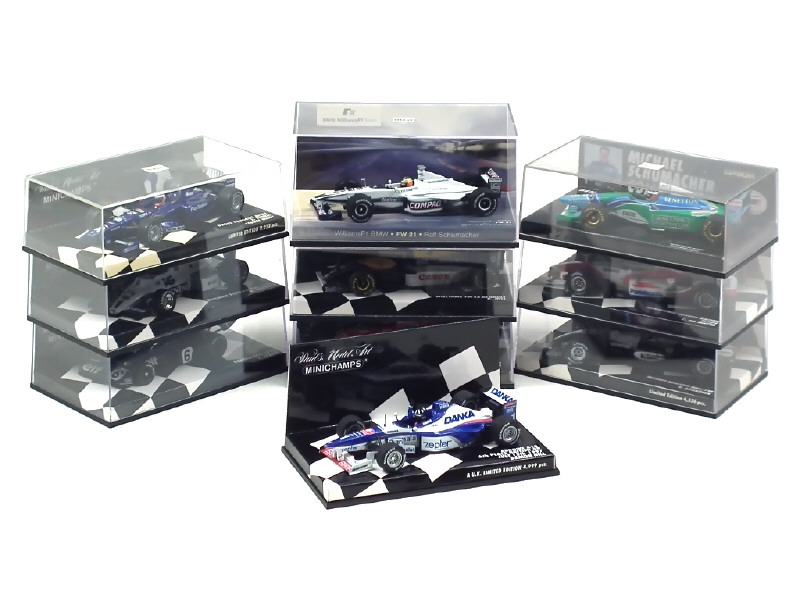 miniatures reproduisant les modèles : BENETTON FORD B193B, Mc LAREN MERCEDES MP4-19B, WILLIAMS FW15 RENAULT, WILLIAMS BMW FW21, PANASONIC TOYOTA TF 104, TYRELL 006, WILLIAMS FORD FW 08C, FERRARI 126 C2, PROST PEUGEOT AP01 & ARROWS A18 - voitures pilotées par : KINI RAIKKONEN, MICHAEL SCHUMACHER, DAMON HILL, RALF SCHUMACHER, C. DA MATTA, FRANCOIS CEVERT, KEKE ROSBERG, GILLES VILLENVEUVE & JARNO TRULLI