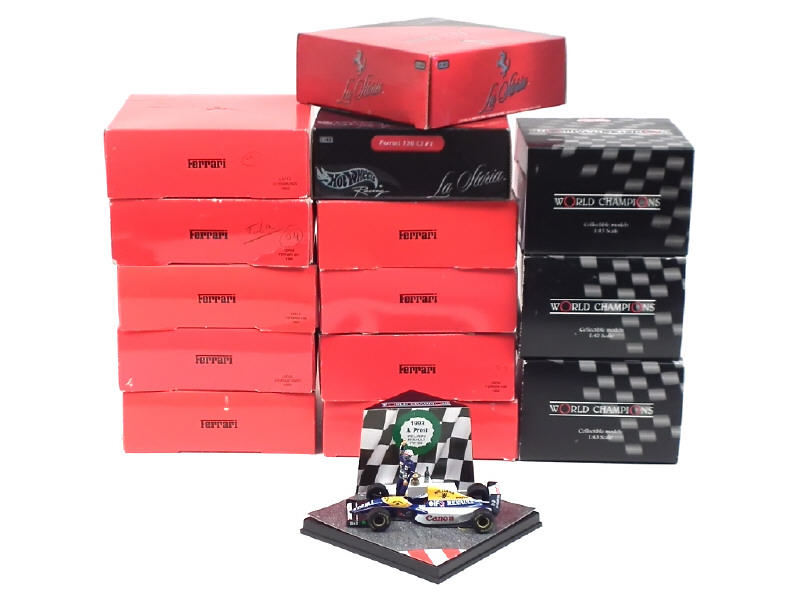 miniatures reproduisant notamment les modèles : BRABHAM-BMW BT50, WILLIAMS RENAULT FW 15B, LOTUS 72D, FERRARI 500 F2 (3 exemplaires), 312 B2, 126 C2, 156 (2 exemplaires), 641, 312T, 375, 640 F/189C & 625 - voitures pilotées par : NIGEL MANSELL, MAURICE TRINTIGNANT, ALBERTO ASCARI, NELSON PIQUET, ALAIN PROST (boîte en état 'c'), EMERSON FITTIPALDI, NICKI LAUDA, PHIL HILL, FROILAN GONZALEZ & LORENZO BANDINI - on y retrouve les marques : VITESSE, MATTEL & QUARTZO - 6 boîtes en état 'b'