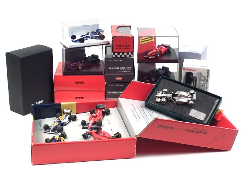 miniatures reproduisant notamment les modèles : PEUGEOT J7 'MATRA SPORTS', WILLIAMS RENAULT FW14B, FOOTWORK MUGEN FA13, FERRARI 412 T2 1995, BMW BRABHAM BT52, FERRARI 625 1954, FERRARI 312 T3 (un petit élément à recoller, boîte en état 'c'), BMW BENETTON B186, FERRARI 641/2, CANON WILLIAMS RENAULT FW14 &14B - voitures pilotées notamment par : NIGEL MANSELL, JARNO TRULI, OLIVIER PANIS, FROILAN GONZALEZ & GERHARD. BERGER - on y retrouve les marques : KYOSHO, ONYX, MINICHAMPS, TROFEU, VITESSE & ELIGOR - 4 voitures regroupés dans un coffret