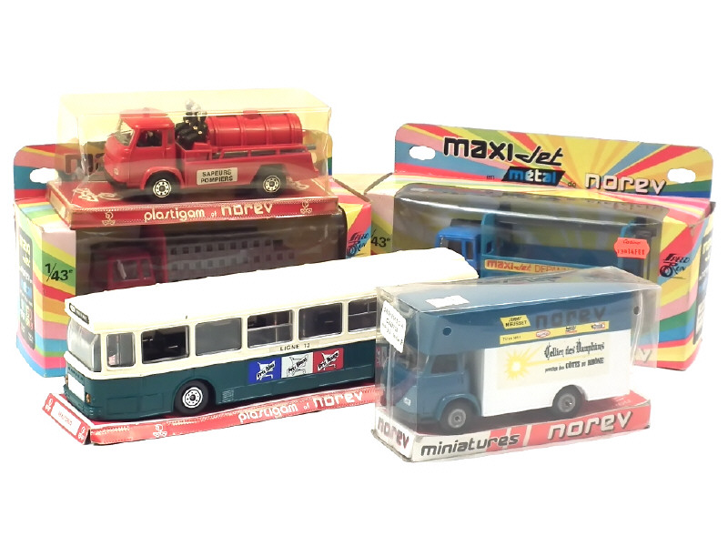 comprend : SAVIEM SG4 fourgon (parties décolorées), SAVIEM dépanneuse & plateau brasseur (les 2 de la série MAXI JET), SAVIEM SG4 citerne de pompiers & SAVIEM SC 10 U autobus parisien (une partie de carrosserie légèrement décolorée, blister incomplet) les 2 de la série PLASTIGAM
