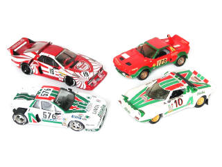 miniatures reproduisant les modèles : FIAT X1-9 ABARTH (un montant de pare-brise tordu), LANCIA STRATOS (manque un globe de phare), LANCIA BETA MONTE CARLO n°19 & n°579 (manque le capot arrière) - on y retrouve les marques : CONTI MODELS, AMR X & AMR BAM X