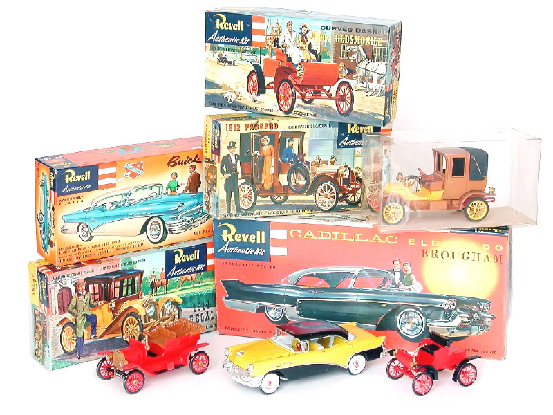 miniatures reproduisant les modèles : PACKARD, FORD T, OLDSMOBILE, BUICK CENTURY, CADILLAC ELDORADO & REGAL - 2 modèles en kit, un modèle sans boîte - les modèles semblent complets - on y joint 4 boîtes vitrine