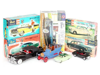 miniatures reproduisant les modèles : LINCOLN CONTINENTAL, ROLLS ROYCE, ROVER, FORD CONSUL, FORD FAIRLANE SUNLINER & CHRYSLER NEW YORKER - 2 modèles en kit - les modèles semblent complets - manque une boite - on y joint 1 boîte vitrine