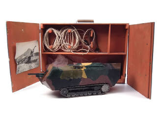 prototype à l'échelle 1/15 ème environ - longueur 70 cm - oeuvre imposante en tôle & métal peint réalisée dans les années 30 dans un petit atelier à Barcelone - avec 2 moteurs MECCANO numéro 2 - présenté dans une caisse en bois avec boîtier de commande & voltmêtre - quelques parties cassées à refixer - on y joint une photo du modèle réel & divers documents se rapportant au char miniature (non testé) - avec manques - UNIQUE REALISATION !