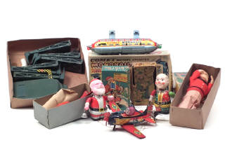 états de 'B' à 'D' - comprend : singe 'CHARLIE CHIMP', PERE NOEL 'MERRY CHRISTMAS', clown 'CIRCUS', avion de chasse à réaction 'SPARKLING PANTHER', monorail 'COMET' & avion de chasse à hélice avec son support - on y retrouve notamment la marque MASUDAYA TOYS - quelques manques - boîtes en états de 'b' à 'e' - modèles motorisés (5 fonctionnels & un non testé) - quelques petites traces d'oxydation - quelques petits manques