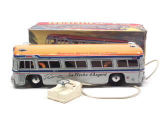 FRANCE JOUETS (FRANCE) Autocar 'LA FLECHE D'ARGENT' téléguidé gris métal, toit orange