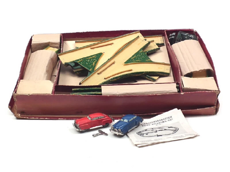 contient : différentes pistes, 2 voitures & éléments permettant la construction de circuits routiers - manque une voiture, quelques éléments & accessoires - avec notice - boîte en grande partie décolorée & tachée