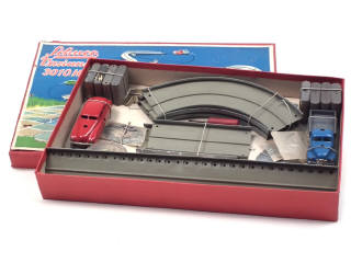 contient : une voiture, un camion (moteurs à clef fonctionnent), 9 éléments de piste, une clef & différents accessoires (dont certains manquants) - sur socle de présentation avec élastiques de maintien - quelques légères traces d'oxydation