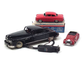 longueur 25,5 cm - mécanismes (à revoir) - avec 2 figurines en composition - petites traces d'oxydation - câble de télécommande coupé - une fixation de tableau de bord défectueuse - 2 pneus craquelés - retouches
