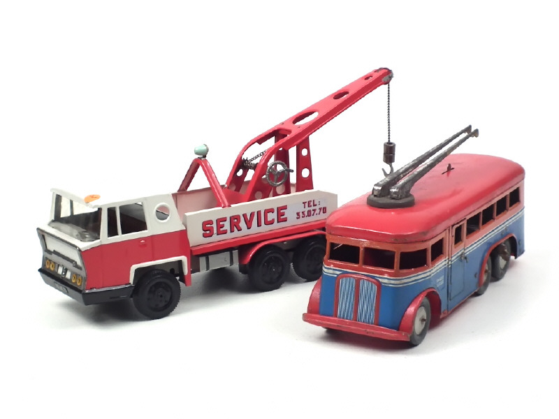 longueur : 37 cm - moteur à clef (fonctionne) - avec grue amovible - légères traces d'oxydation - parties repeintes - roues non d'origine
