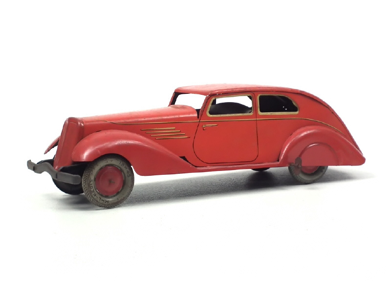 longueur 34 cm - moteur à ressort (fonctionne) - avec direction - parties nickelées ternies - traces d'oxydation - pare-chocs avant fixé à l'envers