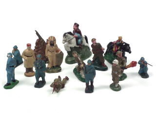 comprend : 2 cavaliers, un mitrailleur, 2 tireurs, 3 grenadiers, 3 soldats au défilé, un avec lance-flamme, un observateur & un médecin - petits manques & parties recollés