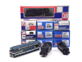 JOUEF 'HO' (FRANCE) Ensemble de 6 locomotives à vapeur, 2 tenders, une motrice & 2 voitures de voyageurs