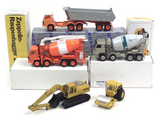 comprend : ZEPPLIN ZR26 pelle rétro sur chenilles (en état 'B'), BOMAG BW213D compacteur, MERCEDES tracteur 6x4 semi-benne basculante 'MEILLER' (un éclat majeur sur la cabine), STEYR porteur 8x4 malaxeur 'STETTER' (avec sachet d'accessoire) & MERCEDES 8x4 porteur bétonnière 'REDYMIX' (avec cale)
