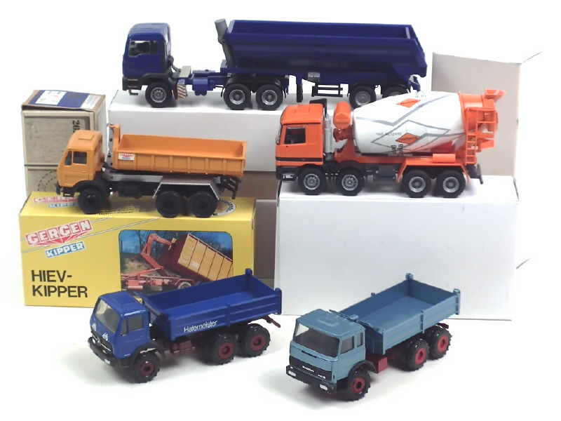 comprend : MAN tracteur 6x4 & semi-benne 2 essieux fond arrondi (avec sachet d'accessoires, sans boîte), IVECO porteur 4x2 benne basculante, MERCEDES porteur 6x4 benne 'GERGEN' (état 'A-), MERCEDES ACTROS 8x4 malaxeur 'REDIMIX' (avec sachet d'accessoires & une cale, traces d'humidité sur l'échappement) & MERCEDES porteur 6x4 benne 'HAFEMEISTER'