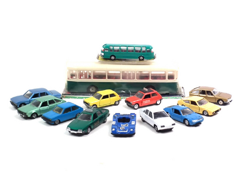 états de 'A' à 'D' - miniatures reproduisant les modèles : RENAULT (un modèle transformé), CITROEN, PEUGEOT, FORD, SAVIEM, MATRA & ALPINE - 11 voitures de la série 'JET CAR' - un modèle avec boîte en état 'c' & un autre à l'échelle 1/86ème avec carrosserie déformée - quelques manques