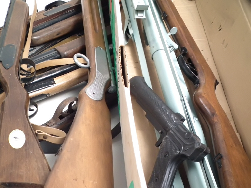 états de 'B' à 'E' - on y joint un coffret 'TIR AU PIGEONS' contenant un trépied, 3 pigeons en carton & 6 flèches (une non conforme) en état 'B.c' avec notice & un pistolet en plastique (état 'E') - 4 carabines de marques indéterminées - non testés - quelques parties repeintes