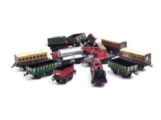 états de 'D' à 'F' - comprend : 7 wagons de marchandises, 4 voitures de voyageurs, 5 tenders & une locomotive à vapeur (moteur à clef fonctionne) - quelques manques