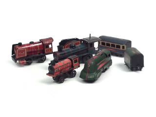 état de 'E' à 'F' - comprend : 4 locomotives à vapeur (un moteur à clef fonctionne), 2 tenders & une voiture de voyageurs