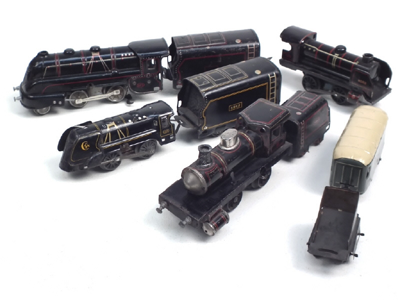 états de 'C' à 'F' - comprend : 4 locomotives à vapeur (2 moteurs à clef & un moteur à ressort fonctionnent), 4 tenders & une voiture de voyageurs - on y retrouve les marques : JdeP & JEP