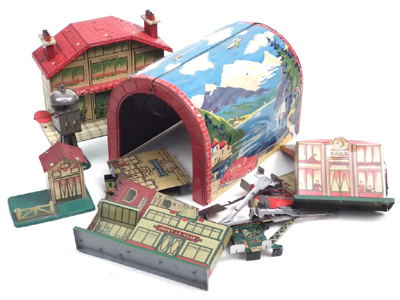 état de 'C' à 'D' - comprend : 3 gares (dont 2 façades), 2 tunnels, halte, sonnerie-avertisseur & 11 éléments de décors - quelques traces d'oxydation & petits manques