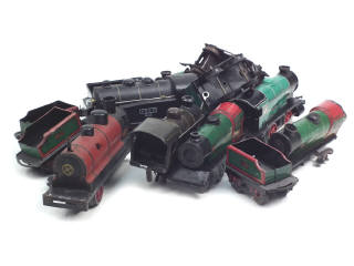 différents écartements - états de 'D' à 'F' - comprend : 7 locomotives à vapeur (une électrique non testée, 3 avec clef dont 2 fonctionnent), 3 à ressort (fonctionnent) dont une avec importantes traces de métal fatigue sur une roue & 6 tenders - on y retrouve notamment la marque HORNBY - avec retouches & manques