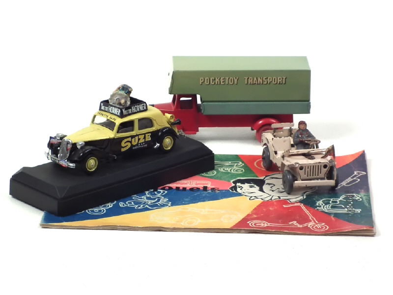 états de 'A-' à 'E' - comprend : CITROEN 15 CV du Tour de France 1954 'YVETTE HORNER' (2 éléments à recoller), JEEP Tour de France & camion plateau bâché 'POCKETOY TRANSPORT' - on y retrouve les marques : STARTER, POLICHINELLE (personnage incomplet) & BRIMTOY (moteur à clef fonctionne) - on y joint un catalogue général de jouets des années 50 en état 'c' (taché par endroits)