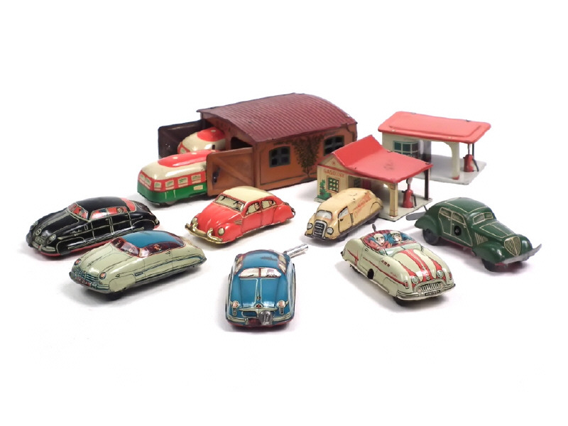 DIVERS (ALLEMAGNE) Ensemble de 2 stations-services, 9 véhicules en tôle & un garage
