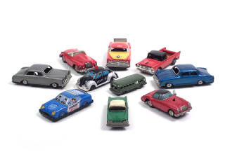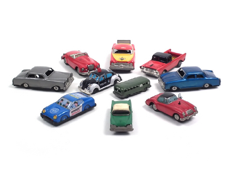différentes échelles - états de 'B' à 'E' - un moteur à ressort (fonctionne) & 6 moteurs à friction (2 à revoir) - miniatures reproduisant notamment les modèles : VOLKSWAGEN COCCINELLE, MERCEDES & AUSTIN HEALEY - on y retrouve notamment la marque LINE MAR TOYS - petits manques - parties chromées ternies & traces d'oxydation