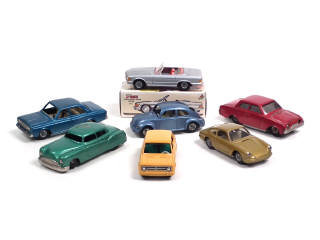 états de 'A' à 'D' - miniatures reproduisant notamment les modèles : VOLKSWAGEN COCCINELLE, MERCEDES 300 SL cabriolet (avec boîte non conforme), PORSCHE 911 & FORD TAUNUS - 5 modèles à friction (fonctionnent) - parties chromées ternies avec traces d'oxydation - un modèle avec importants manques de peinture sur le toit