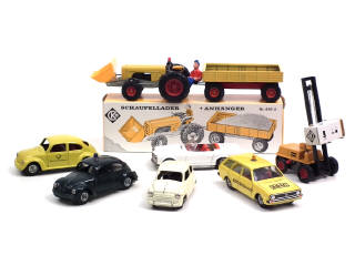états de 'A-' à 'D' - comprend : tracteur agricole avec remorque (en boîte état 'b'), VOLKSWAGEN COCCINELLE (2 modèles différents), PASSAT, MERCEDES 230 SL, FIAT 600 & un chariot élévateur - moteurs à friction (fonctionnent)