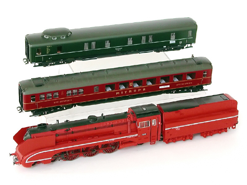 comprend : une locomotive vapeur, un tender, 3 voitures-voyageurs, un wagon-restaurant 'MITROPA' & un wagon à bagages - l'ensemble constitue une rame authentique de la DEUTSCHE REICHSBAHN - on y joint un sachet d'accessoires