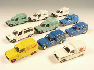 comprend : 5 exemplaires de RENAULT 4 avec les publicités 'SHELL', 'SOLIDO', 'BRIFFOD', 'FRANCE TELECOM', 'GARAGE EUROPEEN' & 5 exemplaires de RENAULT EXPRESS avec les publicités 'PEPSI-COLA', 'ALBERTVILLE 92', 'PERRIER', 'ST-YORRE', 'CONTREX' - manque un pare-chocs avant de RENAULT 4 Fourgonnette